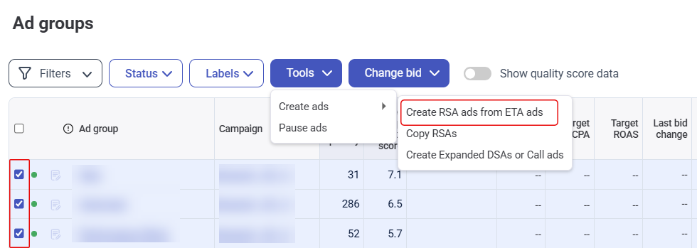 In the **Manage** > **Ad groups** screen, select the ad groups you want to work with. Then, go to **Tools** > **Create ads** > **Create RSA ads from ETA ads**.&#x20;