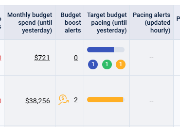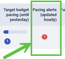 1\) We've added a new column **Pacing alerts** to show full details of all such alerts triggered in your account. This will save you from having to go into the account to see the full details. Simply click on the alert icon (if shown) to see all alerts.
