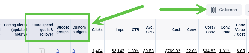 3\) Three new columns were added to show the settings of any **future spend goals, rollover, budget groups or custom budgets** you might have. These columns are hidden by default but can be enabled the usual way.