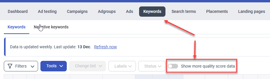 2\) The quality score columns in the Keywords screen are now hidden by default to save screen space.  You can see them by toggling the below option: