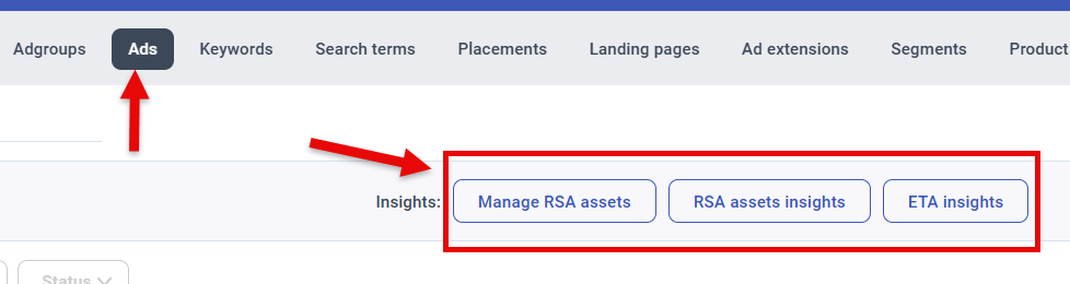 **ETA insights**: this Expanded text ads (ETAs) tool shows the aggregate performance of the headlines and descriptions used by this legacy ad type (for accounts that still use them).  This tool also moved from the *Dashboard > Structure insights* screen to the *Ads* screen. &#x20;