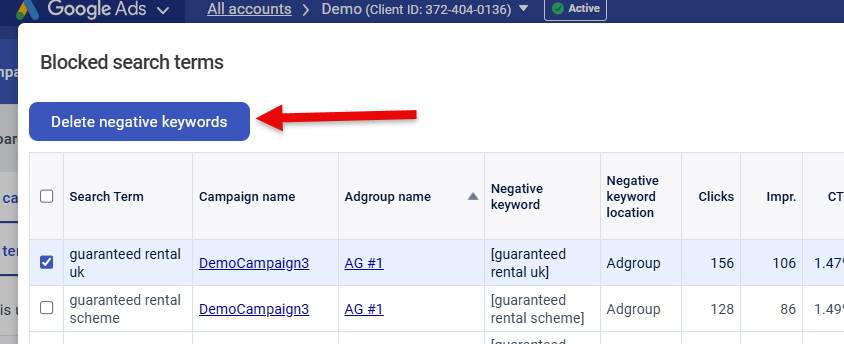 To remove any unwanted negative keyword simply select it and use the newly added **Delete negative keywords** button.