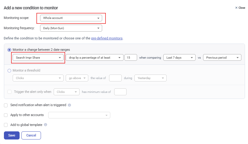 You can also create a performance monitor under **Audit** > **Performance alerts**, covering your whole account or specific campaigns (by name or label).